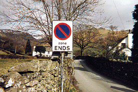 The blue-and-red circular sign on its own means that waiting restrictions are in force. This sign shows that you're leaving the controlled zone and waiting restrictions no longer apply.