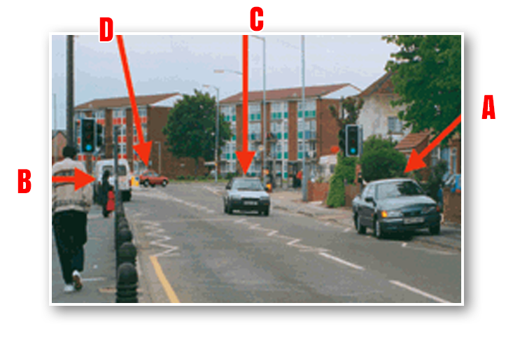 The car arrowed A is parked within the area marked by zigzag lines at the pedestrian crossing. Parking here is illegal. It also • blocks the view for pedestrians wishing to cross the road • restricts the view of the crossing for approaching traffic.