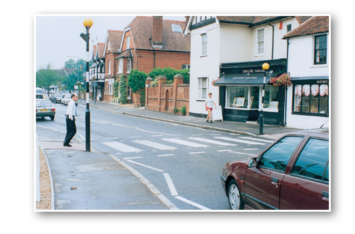 Look well ahead to see whether any hazards are developing. This will give you more time to deal with them in the correct way. The man in the picture is clearly intending to cross the road. You should be travelling at a speed that allows you to check your mirror, slow down and stop in good time. You shouldn't have to brake harshly.