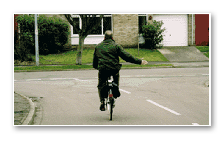 Keep well back and give the cyclist time and room to turn safely. Don't intimidate them by getting too close or trying to squeeze past.
